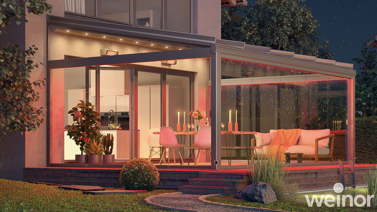 Mit einer weinor Glasoase® kann die Terrassensaison bereits im Frühjahr beginnen und sich bis in den Herbst hineinziehen. Zusätzliches Zubehör wie LED-Beleuchtungen oder Heizsysteme sorgen für Wärme und Ambiente, wenn die Tage noch oder schon wieder kürzer sind. Und wenn es draußen richtig sommerlich wird, lässt sich die gläserne Front komplett beiseiteschieben.